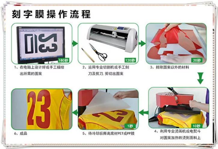 先在电脑上面设计好图案,再运用刻字机/激光/打标机切割机切割好图案,撕离图案外多余的部分,将装饰膜图案放在将要烫印的服饰上面,通过热转印烫画机转烫,撕离表面的PET离型底材,最后做成成品。
