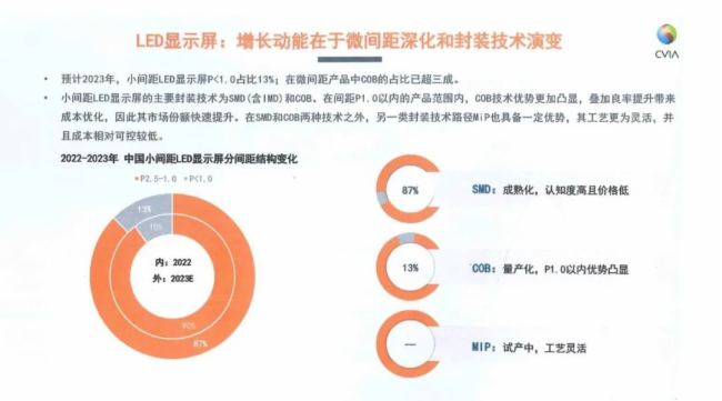 中国电子视像行业协会发布(CVIA)《2023年中国电子视像行业发展报告》,认为“LED显示屏:增长动能在于微间距深化和封装技术演变”“预计2023年,小间距LED显示屏 P<1.0占比13%;在微间距产品中COB的占比已超三成”,报告指出:“在间距P1.0以内的产品范围内,C0B技术优势更加凸显,叠加良率提升带来成本优化,因此其市场份额快速提升”。